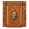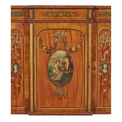 the crossbanded top above a breakfront frieze, over a central cupboard door painted with an oval reserve depicting 'The Disarming of Cupid' after Angelica Kauffmann, and flanked by tapered corner columns, raised on turned and tapered feet, painted with floral garlands, swags, and classical busts