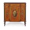 LATE VICTORIAN PAINTED SATINWOOD, ROSEWOOD, BOXWOOD AND EBONY LINED BREAKFRONT SIDE CABINET Y