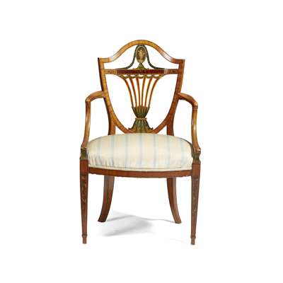 in the Sheraton style, the shield back with a pierced vasiform splat painted en grisaille with a putto, above a stuffover seat and downswept arms, raised on square tapered legs painted with flower trails