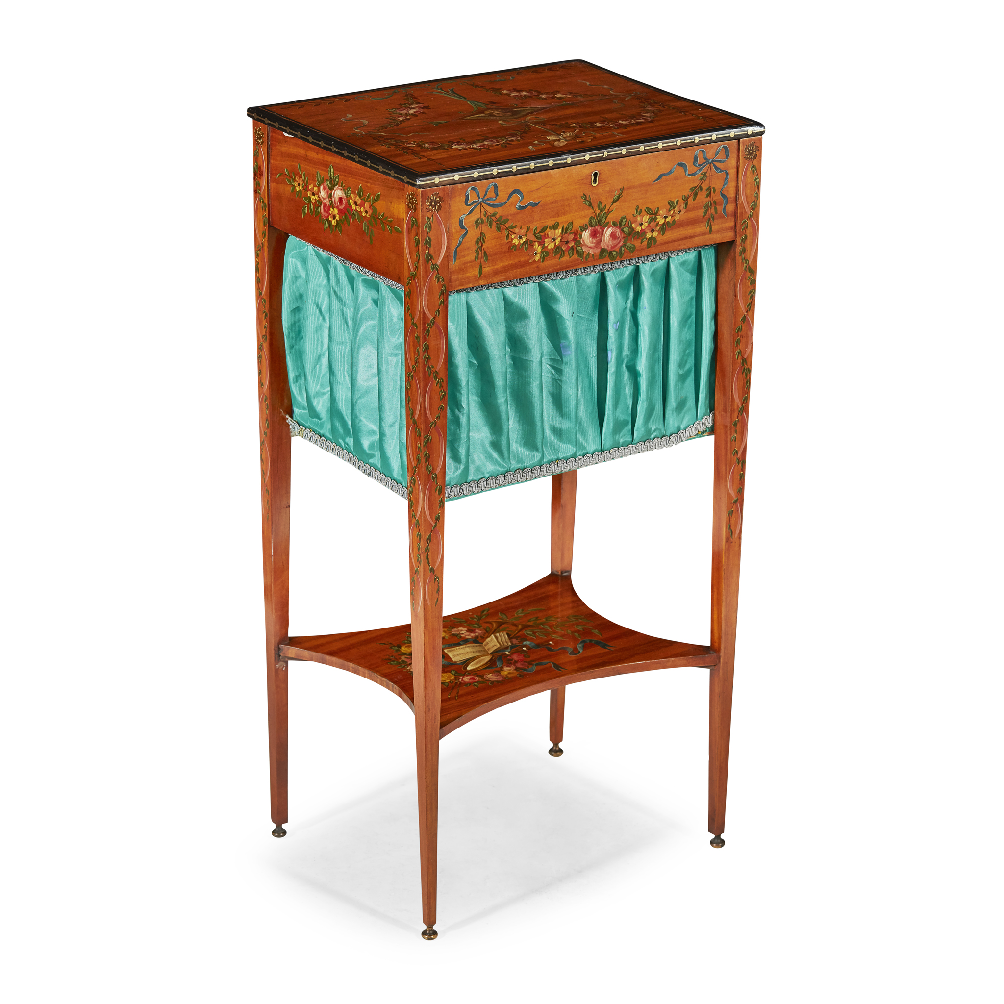 EDWARDIAN PAINTED SATINWOOD AND BRASS INLAID WORK TABLE