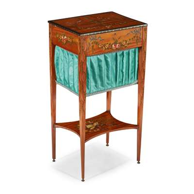 the hinged top with brass inlay opening to a compartmented interior and sliding work box, raised on square tapered legs joined by a shaped undertier, ending on brass feet; painted with flower sprays, garlands, putto, and a musical trophy