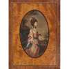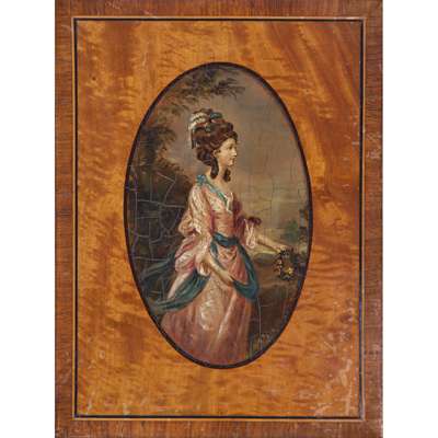 the superstructure with a drawer and pair of cupboard doors around a recess, the doors painted with oval reserves of 18th century ladies, the lower part with a crossbanded top over three short frieze drawers, raised on square tapered legs painted with husk trails and ending in spade feet