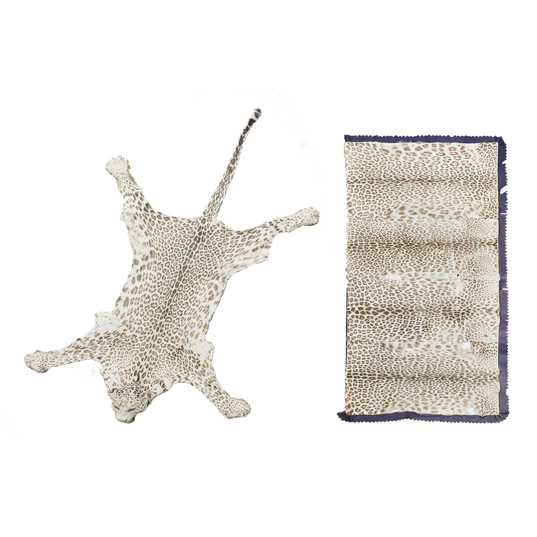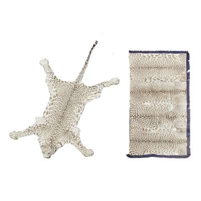 with inset glass eyes and painted open mouth, some claws present, 246cm long approx.; together with a LEOPARD SKIN CARRIAGE RUG, made up of four skins, on a black felt backing, 205cm x 96cm (2)