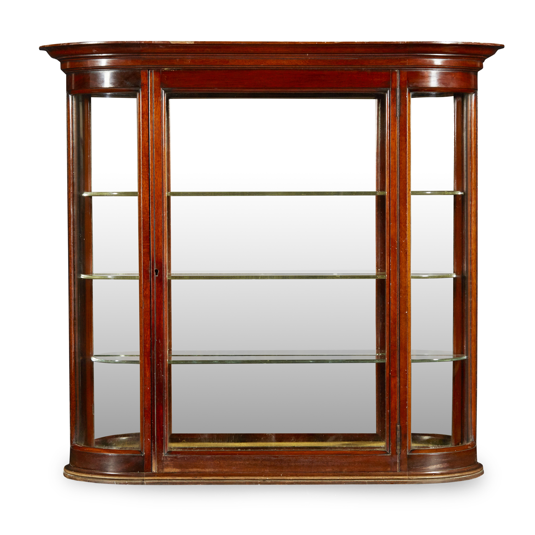 of bowfront outline, the moulded cornice above a glazed door and side panels enclosing a mirror back and glass shelves