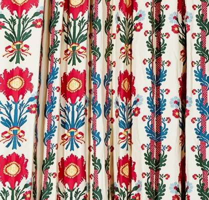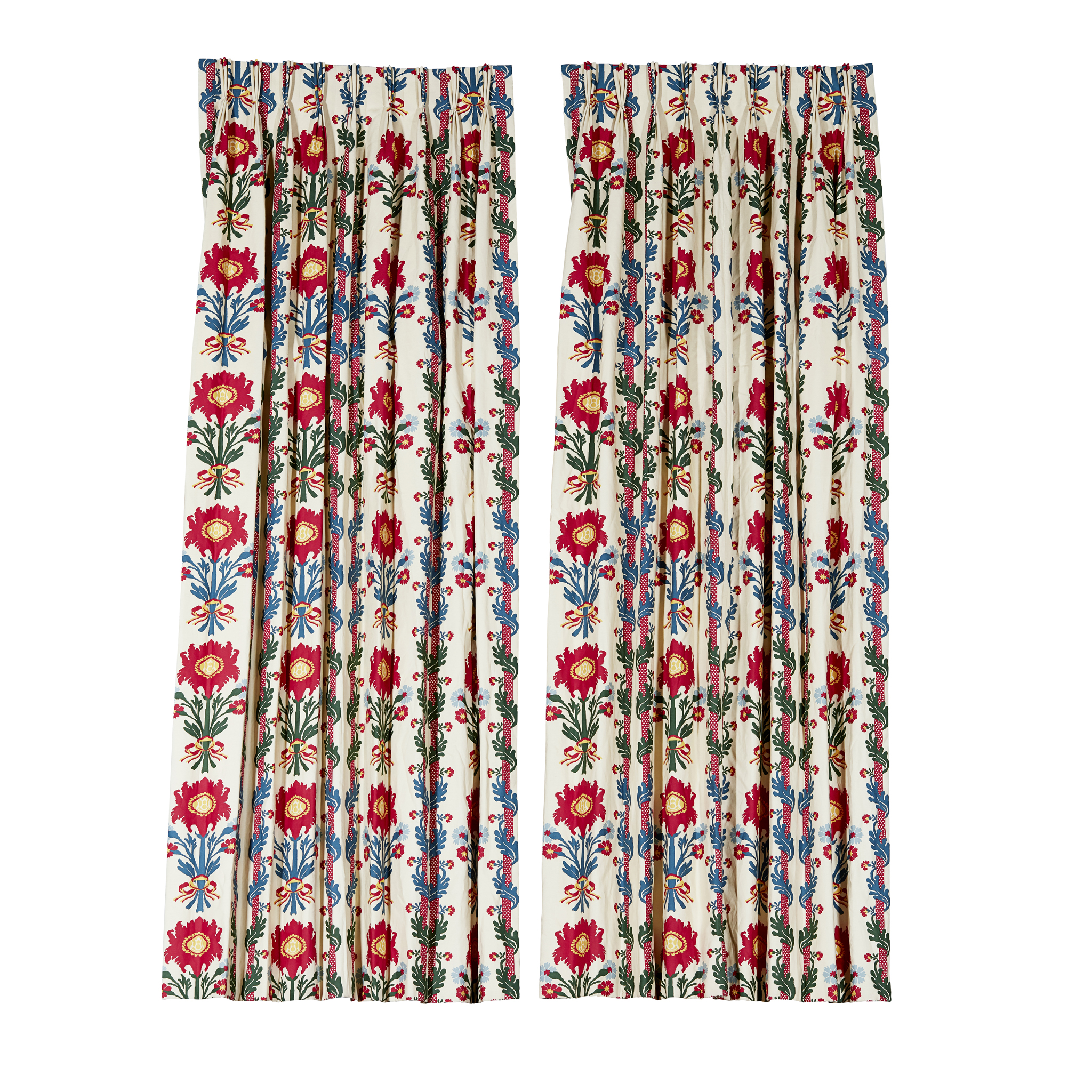 with a repeating pattern of red and blue flower posies with alternating vertical red polka-dot stripes entwined by blue and green vines (2)