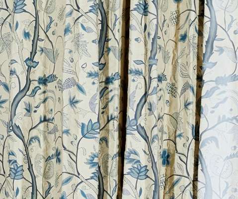 in a blue and cream repeating pattern of leafing trees with pomegranates (1)