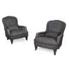 the arched backs and low scroll arms above wide seats, raised on ebonised bracket feet, covered in gunmetal grey upholstery (2)