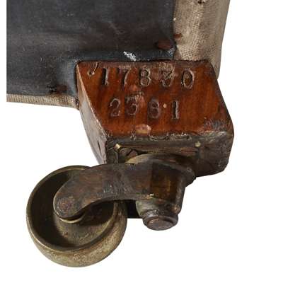 with low backs and open padded arms above deep wide seats, raised on turned legs with castors; one chair stamped 17830/2361; covered in grey cotton duck canvas (2)