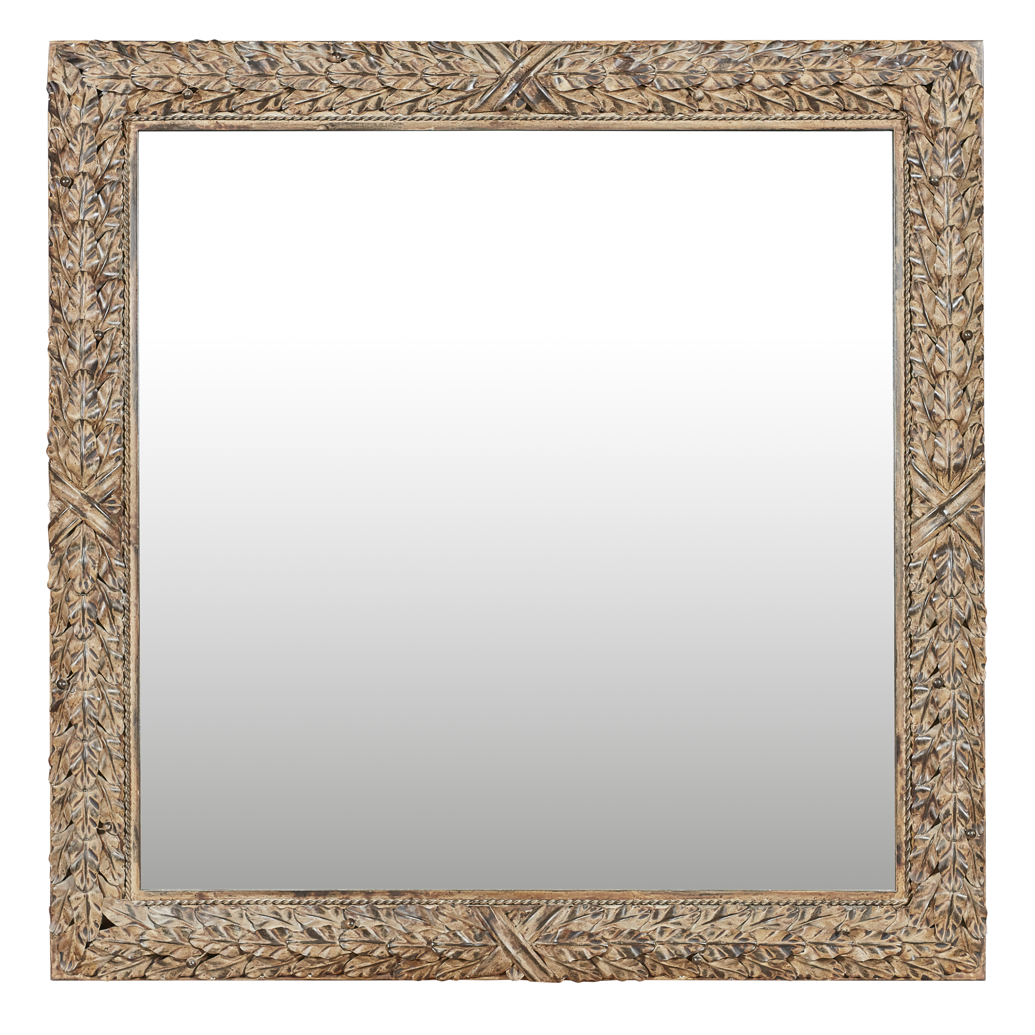 the square mirror plate in a metal cushion moulded frame applied with tied laurel leaf garlands