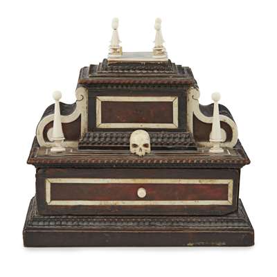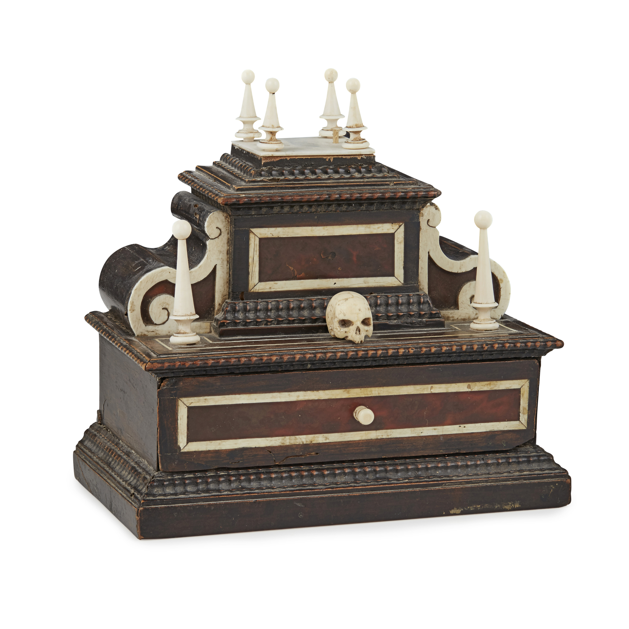CONTINENTAL STAINED FRUITWOOD, TORTOISESHELL AND IVORY MEMENTO MORI Y