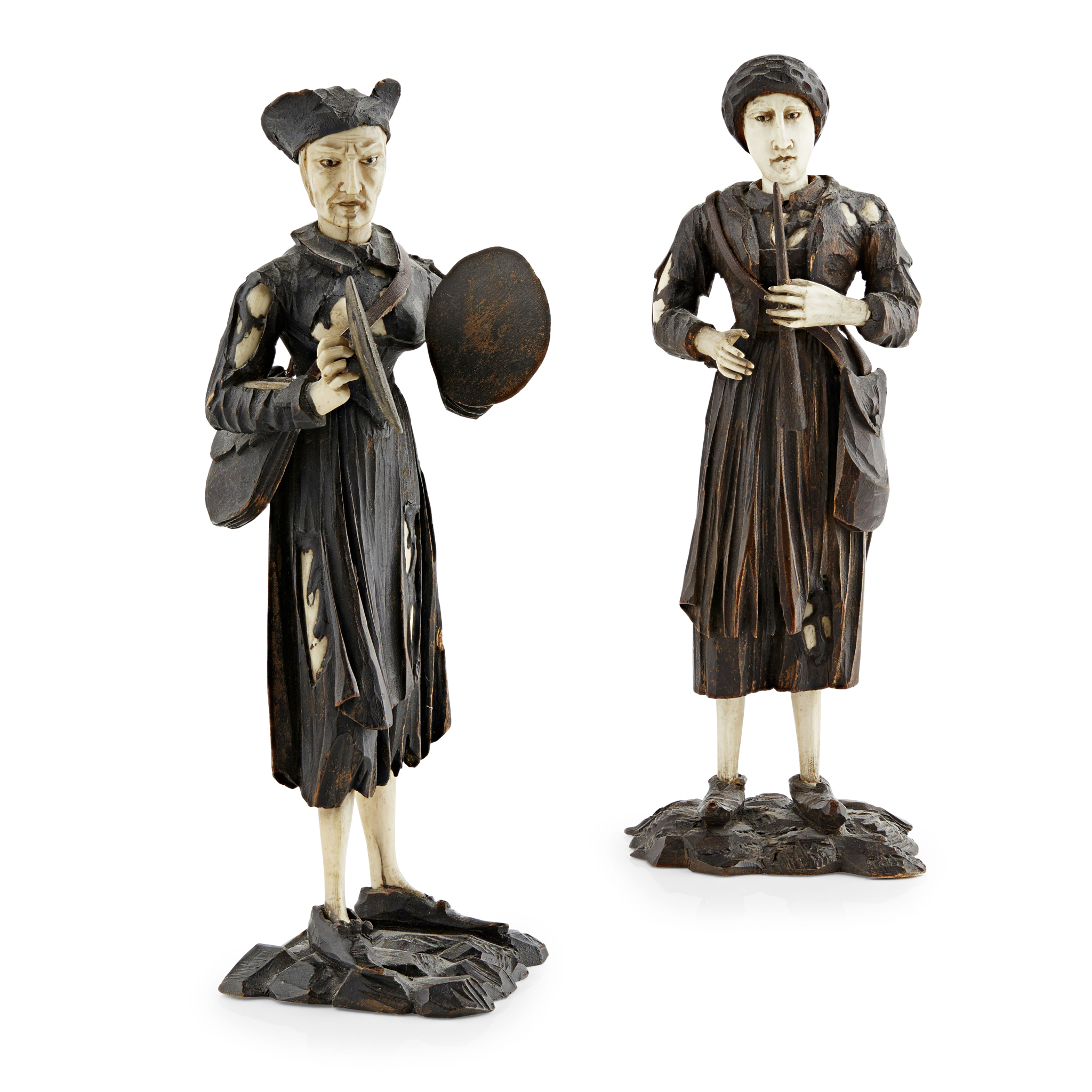 TWO CONTINENTAL CARVED IVORY AND WOOD FIGURES, IN THE MANNER OF SIMON TROGER Y