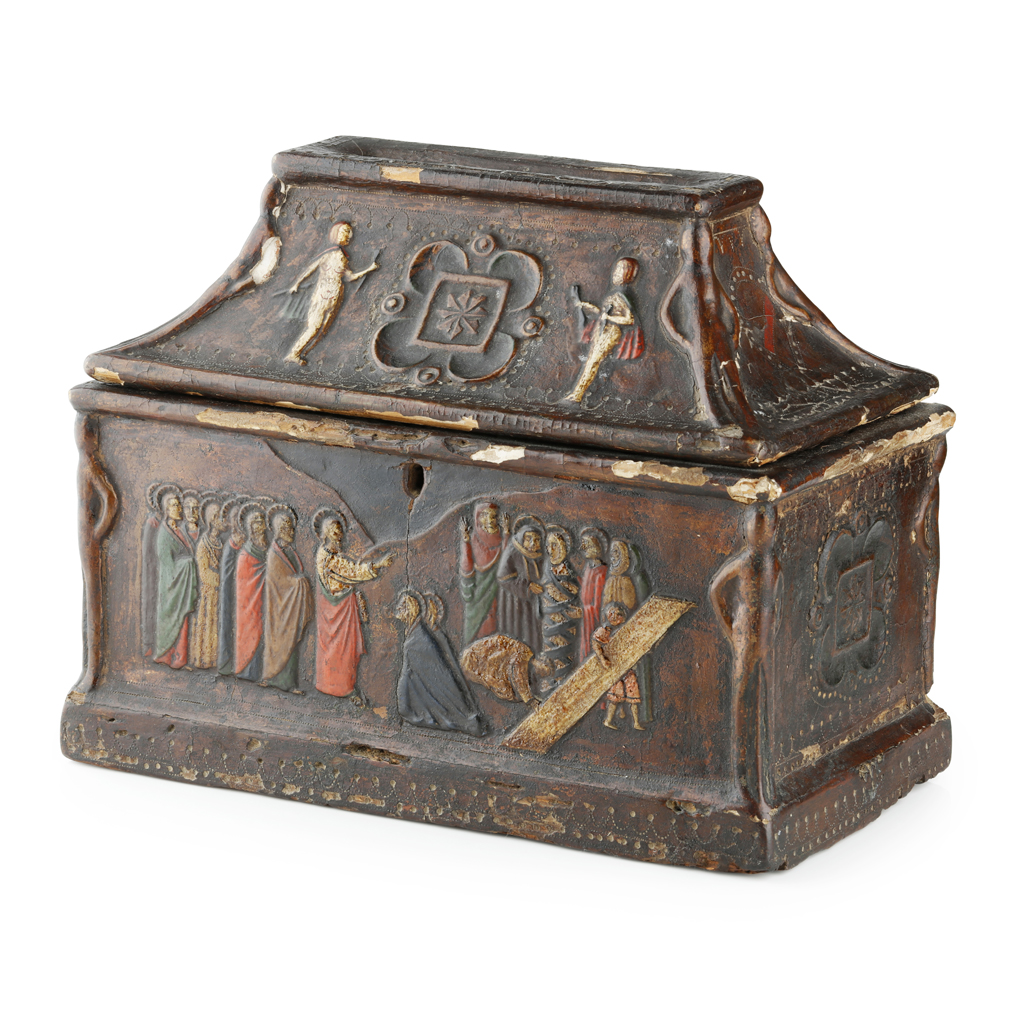 in the 15th century style, decorated in relief with scenes from the life of Christ, including the raising of Lazarus and Christ and Mary Magdalene after the Resurrection