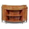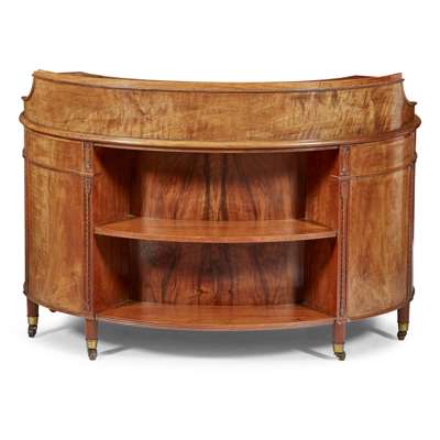 the superstructure with drawers, cupboards, and a central recess above a central drawer and recess flanked by banks of four drawers, the reverse with open shelves, raised on reeded legs with brass caps and ceramic castors