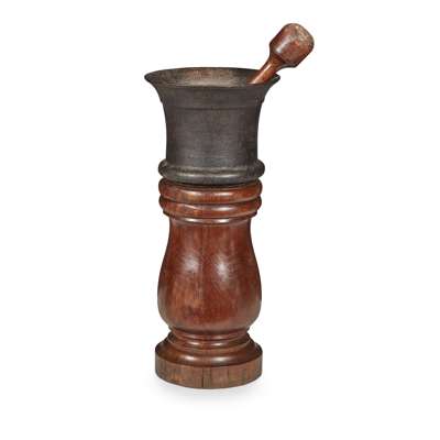 with a double ended laburnum pestle and iron mortar, on a later baluster column