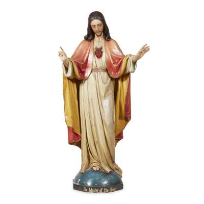 the near life-size figure in robes wearing the Sacred Heart, with arms raised in blessing, standing on a celestial dome and octagonal base inscribed 'The Master of the House'