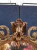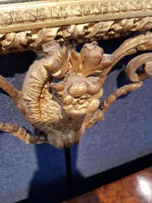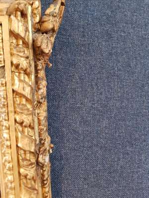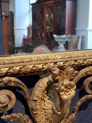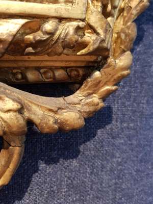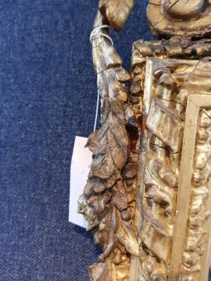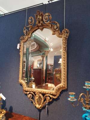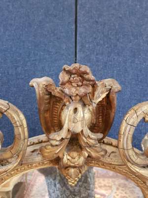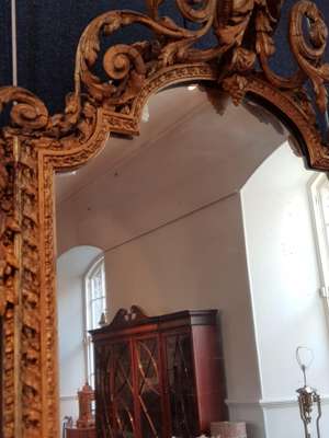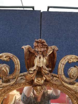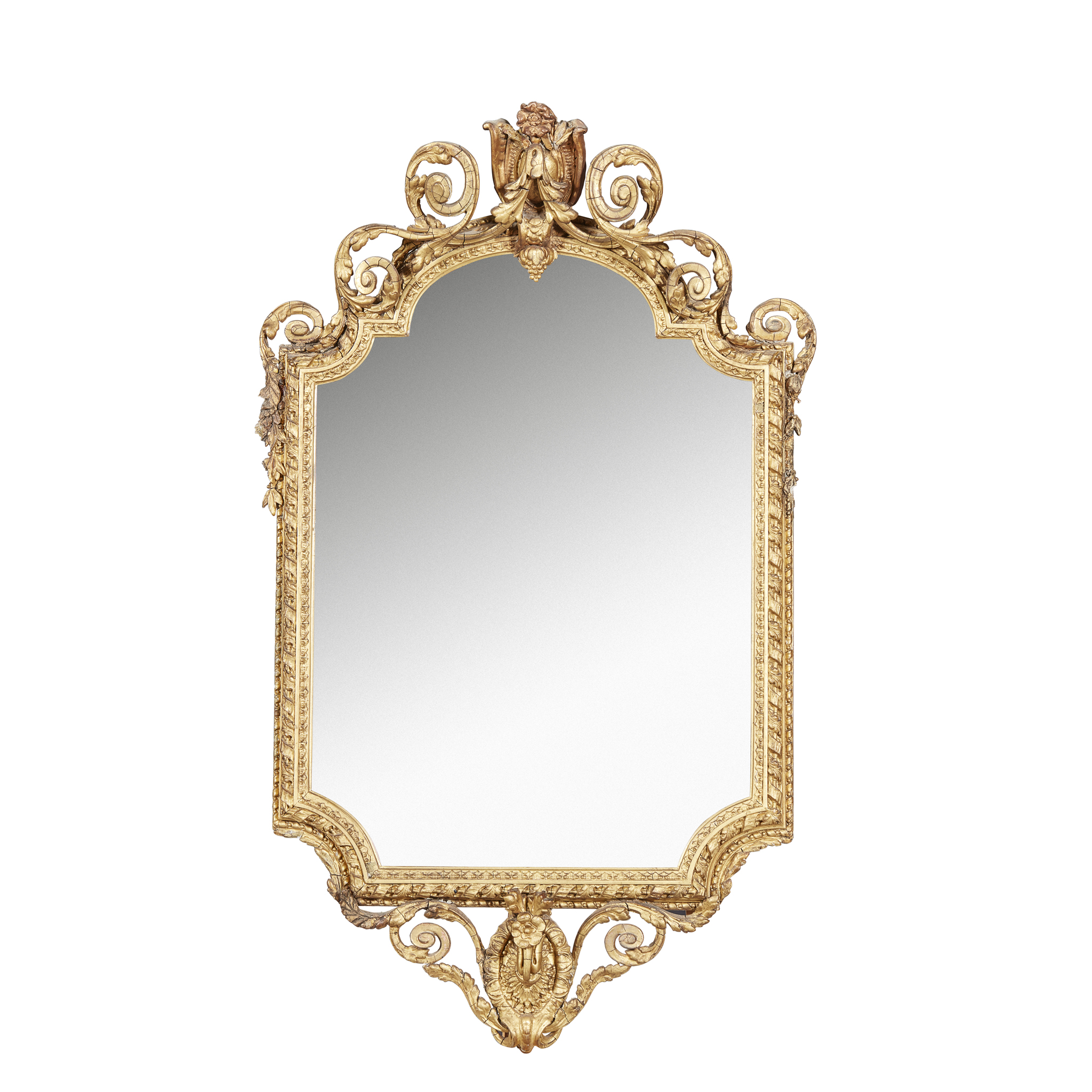 the shaped mirror plate with foliate scroll cresting and central cartouche and sunflower pendant finial