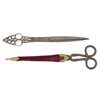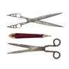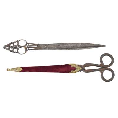 with pierced scrollwork handles and engraved blades SERVIMOS. A NTRO. DUENO Y SENOR, the other side EN ALBACETE. CASTELLANOS. FECIT. R & S, 31.5cm long; together with a PAIR OF CONTINENTAL IRON SCISSORS, 18th century, in a red velvet sheath with gilt brass mounts with foliate engravings, 32cm long (2)