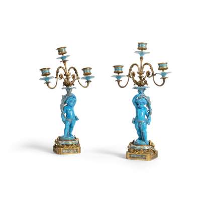 PAIR OF SÈVRES STYLE PORCELAIN AND GILT BRONZE FIGURAL CANDELABRA