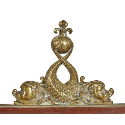 the hinged glazed panel top opening to a silk lined interior, raised on slender brass supports with fluted brass-lined mahogany bases joined by an interlaced undertier with a central gilt-bronze twin dolphin finial, on tapered feet, stamped ALIX four times to the underside