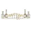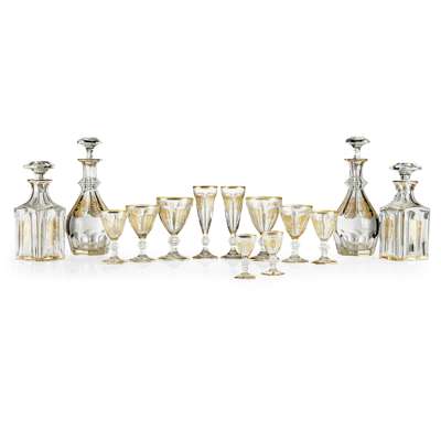 decorated in gilt with repeating panels of stylised hearts above palmettes on oval-cut bowls, raised on facetted knopped stems and hexagonal feet, with acid-etched maker's marks, comprising 12 water glasses, 15cm high; 12 red wine glasses, 13.5cm high; eight white wine glasses, 12.5cm high; nine liqueur glasses, 9cm high; 16 champagne flutes, 17.5cm high; three bottle-form decanters and stoppers, 30cm high; and three square-shaped decanters and stoppers, 24.5cm high (63)