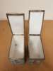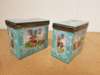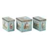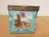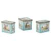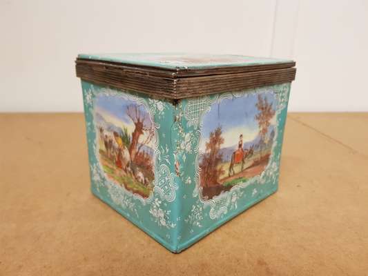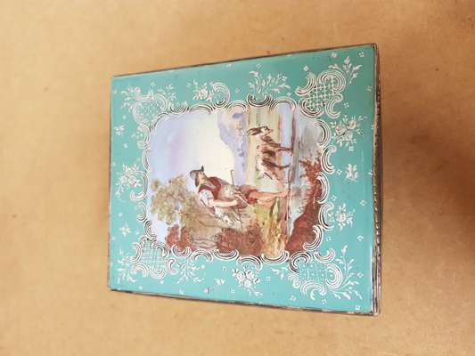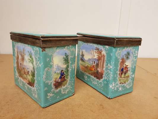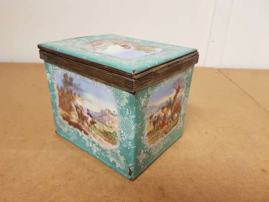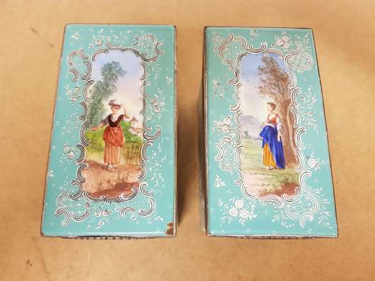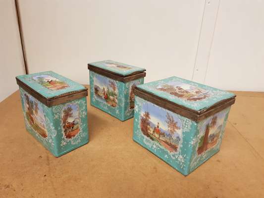 decorated with reserves with figures within pastoral settings on pale turquoise grounds, with metal mounts marked STERLING, comprising two rectangular boxes, 8cm x 12.5cm x 14.5cm; and a square box, 12.5cm x 12.5cm x 14.5cm (3)