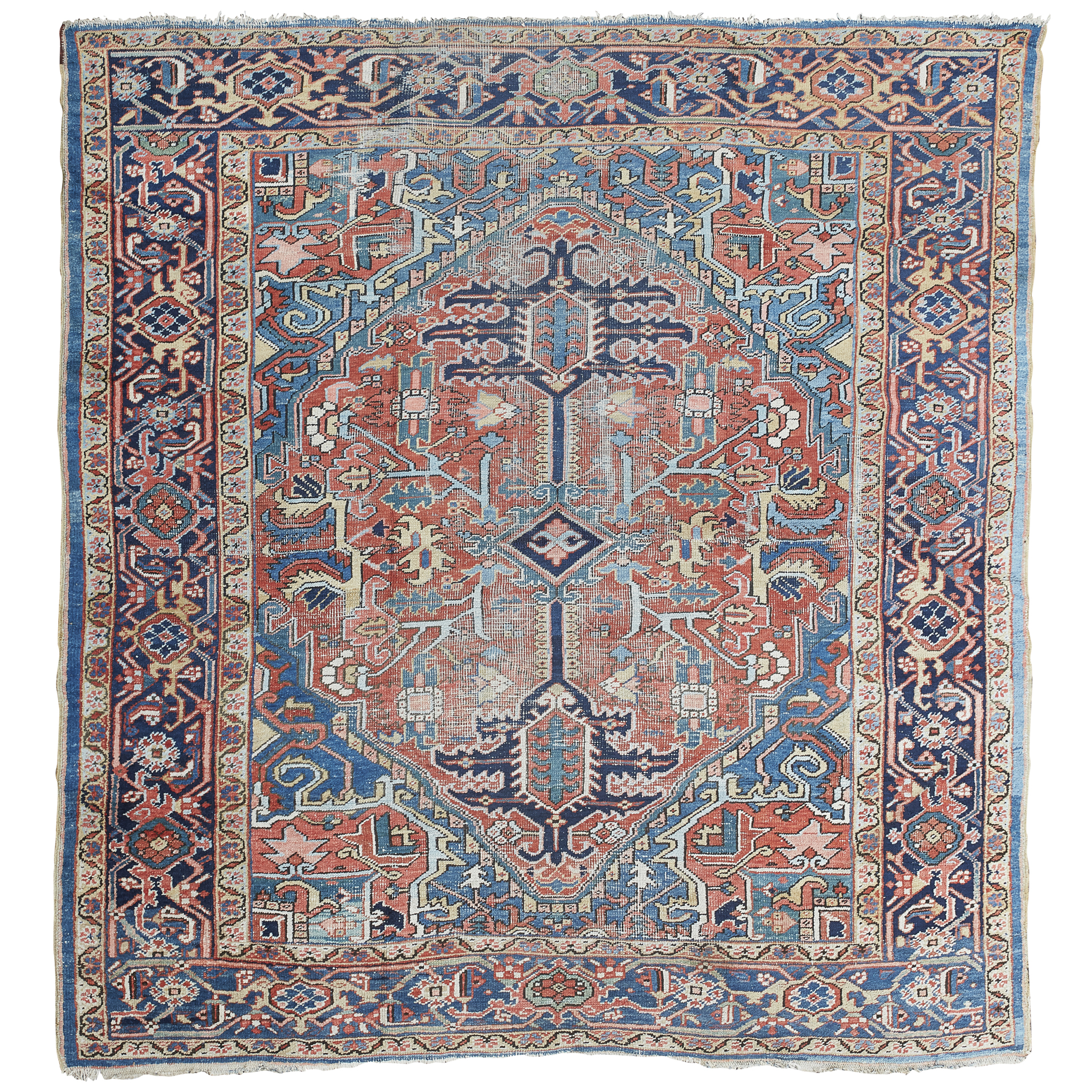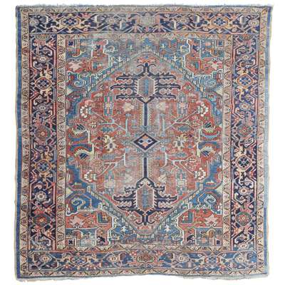 the brick red field with small indigo lozenge medallion, blue, red and green spandrels, within indigo turtle palmette and vine border