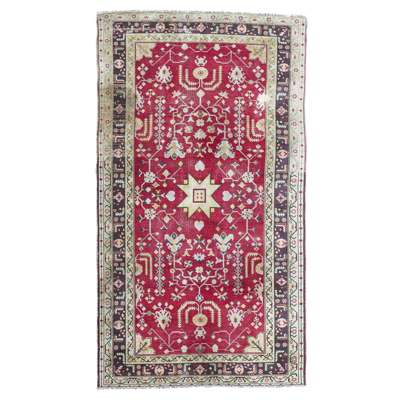 the raspberry red field with small star medallion and floral motifs, within narrow dark grey stylised vine border