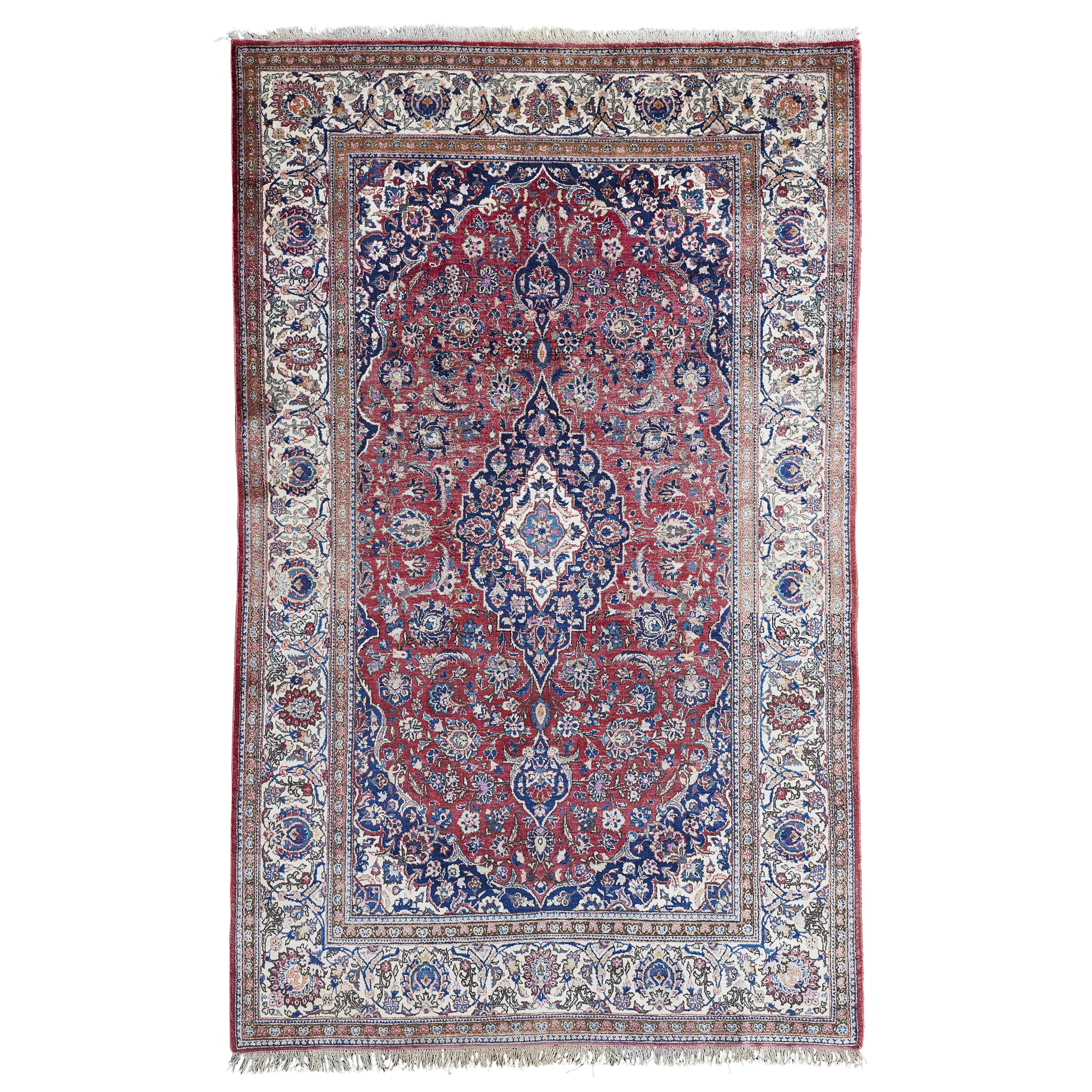 the red field with indigo medallion, indigo spandrels, within cream palmette and arabesque vine border