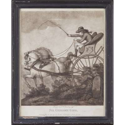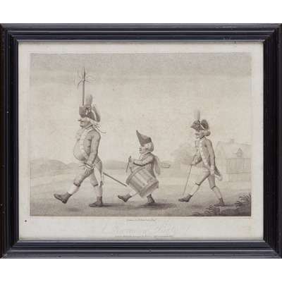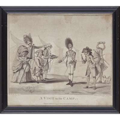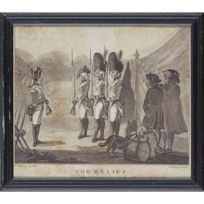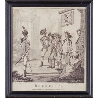 titled 'Recruits', 'A Vist to the Camp', 'A Recruiting Party', and 'The Relief', variously published, in ebonised glazed frames, largest 30cm x 34.5cm; together with a further PRINT, DESIGNED BY W. H. BUNBURY, titled 'Sir Gregory Gigg', published July 23rd 1782 by J. R. Smith, London, , similarly framed, 31.5cm x 25cm (5)