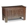 the hinged top with a moulded edge above a triple panel front carved with stylised flower and geometric motifs, raised on stile feet