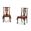the scroll carved top rails above pierced and interlaced splats, over drop-in seats raised on foliate carved cabriole legs with claw and ball feet (2)