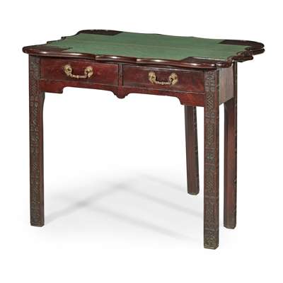the serpentine top opening on a gate leg to a make a tea table and a further leaf opening to a green baize lined playing surface, above two short frieze drawers, raised on square chamferred legs with blind fret carving