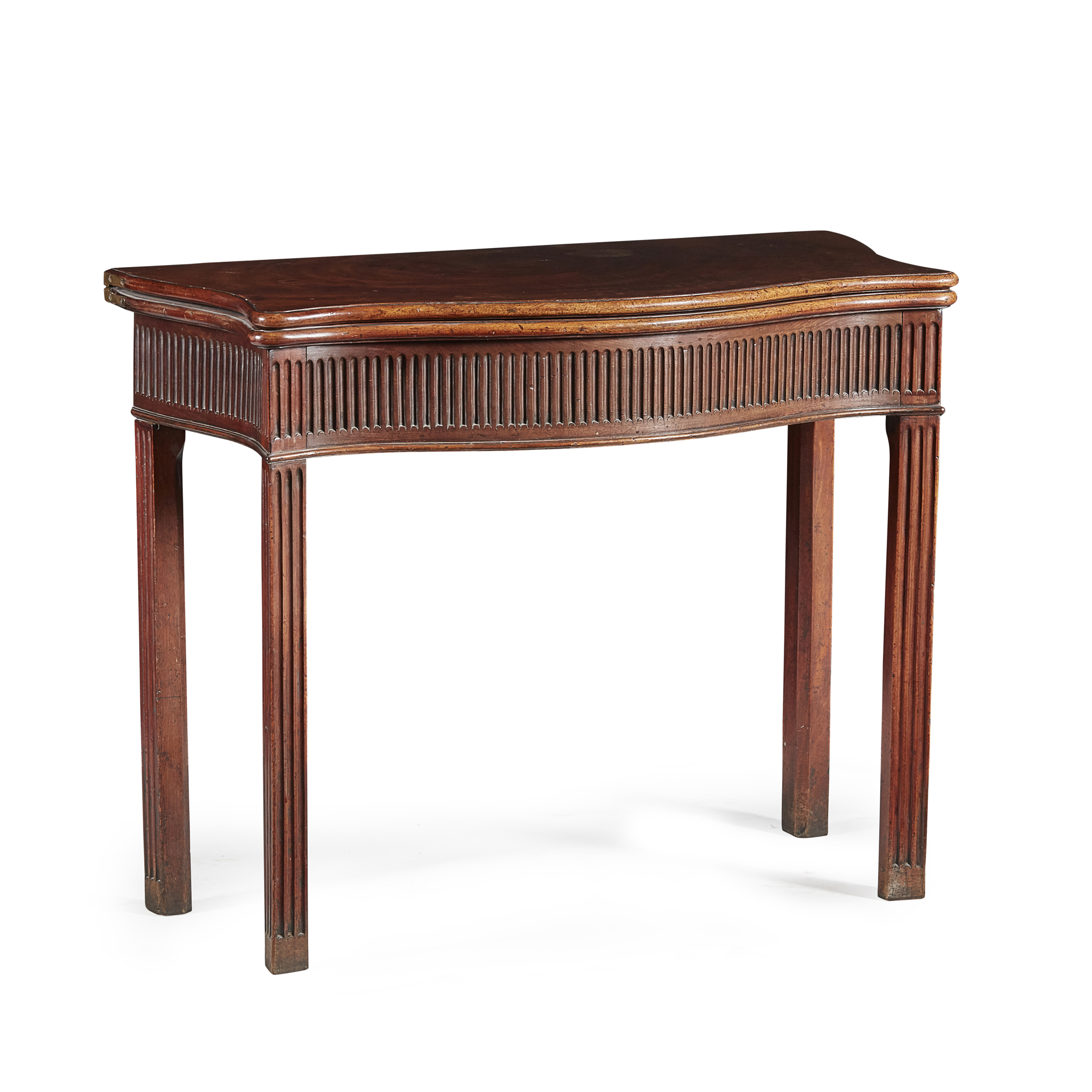 the well-figured fold-over top above a fluted frieze, raised on straight chamfered and fluted legs