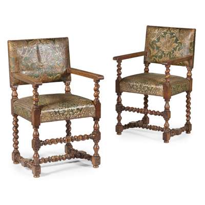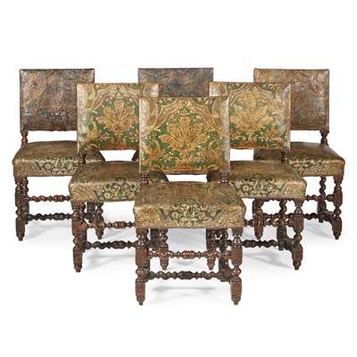the square padded backs and seats covered in green and gold decorated leather, raised on turned and spiral carved legs joined by stretchers, comprising six side chairs and a pair of armchairs