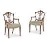 in the Sheraton style, comprising ten side chairs and a pair of armchairs, the shield shaped backs with pierced vase splats carved with wheat stalks and foliage, above bowed stuff-over seats raised on channel moulded square tapered legs with spade feet, stamped to inner rear leg MORISON AND CO. EDINBURGH and A7318