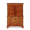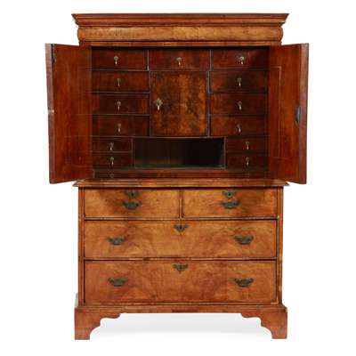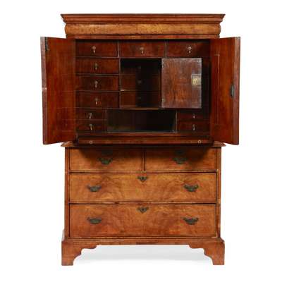 the moulded cornice over a cushion frieze drawer above two doors opening to an interior fitted with a central door, drawers, pigeon holes, and a brushing slide; the lower section with two short and two long drawers, raised on bracket feet