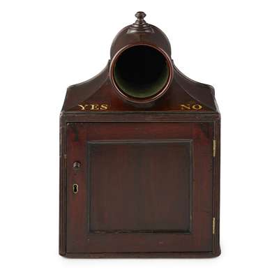 with a cylindrical aperture above a moulded door, with gilt letter YES/NO, opening to baize lined drawers lettered Y and N; with a group of later glass voting marbles