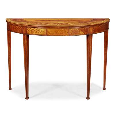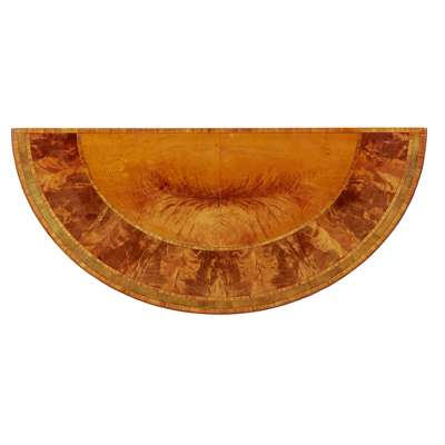 FINE LATE GEORGE III SATINWOOD KINGWOOD, AND FRUITWOOD DEMILUNE PIER TABLE
