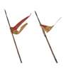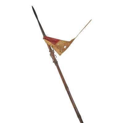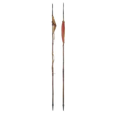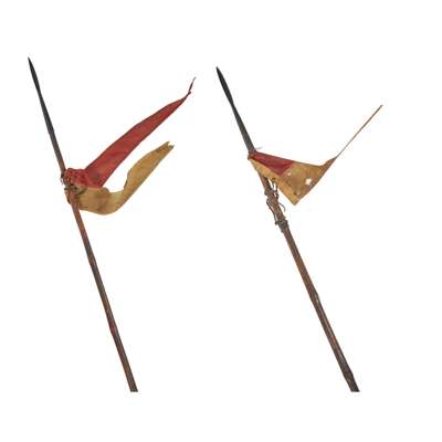 each with a metal tip with a short flat double edged blade, the metal ferrule with short spike, with the remains of pennants