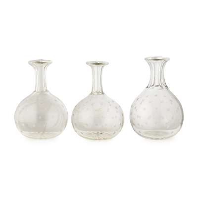 SIX EARLY VICTORIAN ENGRAVED GLASS CARAFES