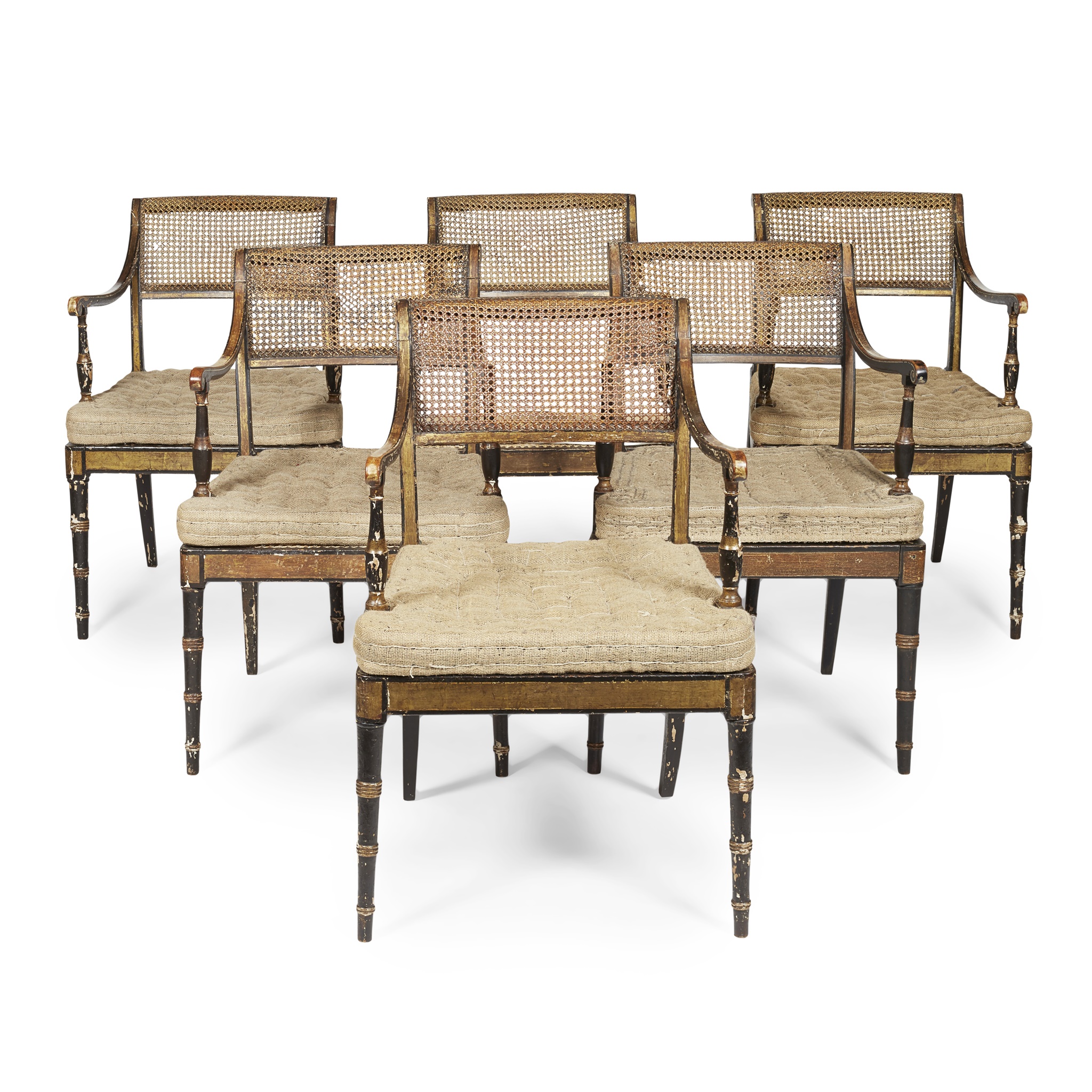 SET OF SIX REGENCY EBONISED AND PARCEL GILT ARMCHAIRS BY JOHN GEE