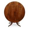 the circular tilt top with a bead moulded edge, on a tapered quadripartite column raised on foliate carved hipped sabre legs, all outlined with bead moulding and ending in foliate cast brass caps and castors