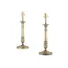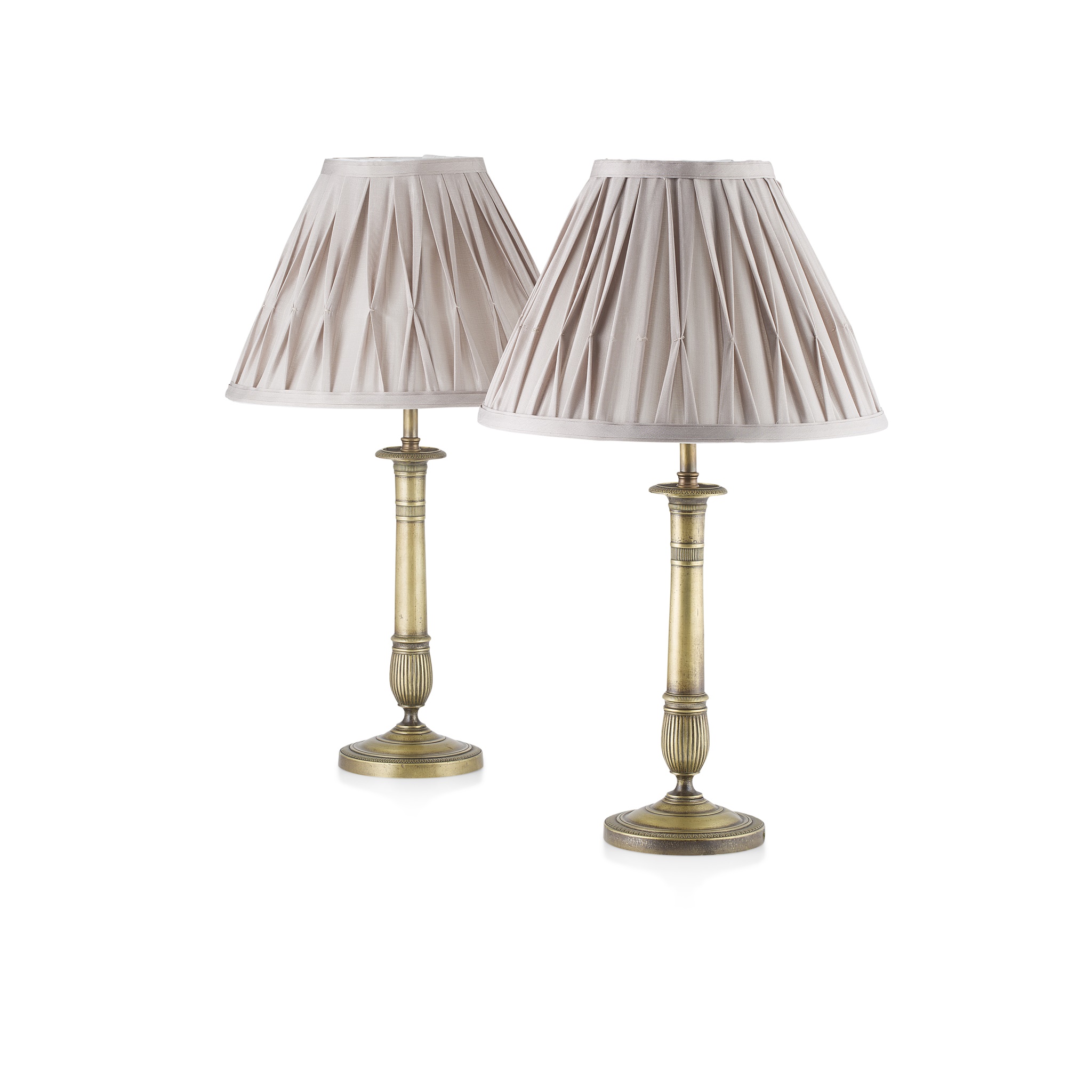 converted from candlesticks, with everted drip trays with leaf-frond borders, on engine-turned tapered columns and circular bases, with grey pleated shades; converted for electricity