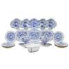 transfer-printed in blue and white, with yellow/brown borders, comprising two covered sauce tureens, with integrated stands, impressed 10 and 12, 17cm high; three small platters, with pierced rims, 24cm wide; four quatrefoil-form dishes, 21cm across; an oval diamond-form dish, 25.5cm wide; nine plates with pierced rims, 18cm diam.; and a pierced basket, 25.5cm wide