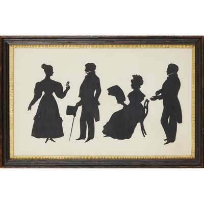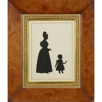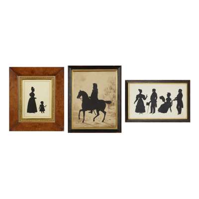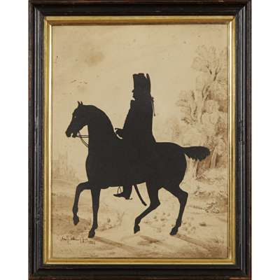 depicted in uniform on horseback, against an ink wash landscape, signed and dated, framed with paper label verso; together with TWO SILHOUETTES, ATTRIBUTED TO AUGUSTIN EDOUART, comprising a four figure group of the Eliott family, dated 1830, framed, 27cm x 45cm; and a double silhouette of Mrs William Napier and Master George Napier, dated 1831, framed with handwritten label verso, 25cm x 18cm