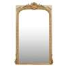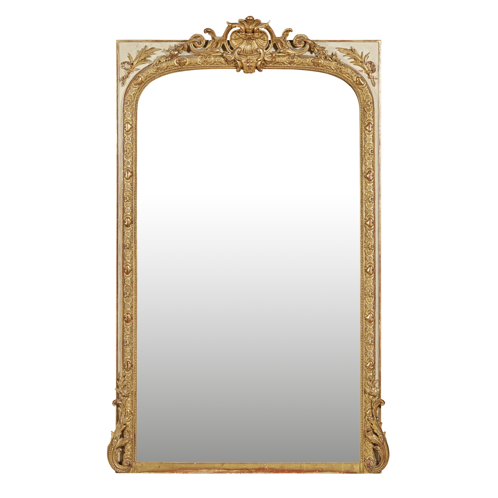 the arched mirror plate in a moulded giltwood frame with shell and foliate cresting, within a cream painted back panel mounted with palmettes