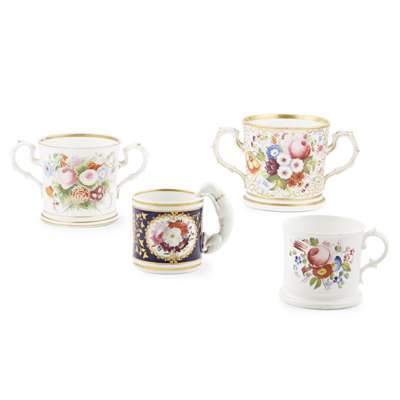 all decorated with flowers, comprising two Coalport-type loving cups, the largest with a gilt scrolled ground; the other inscribed PRESENTED TO MARY JAMES 1856., 12.5cm high; a smaller mug with a dog-form handle, bead moulding and cobalt ground, painted mark 219, 12cm high; and the smallest example inscribed A GIFT, 9.5cm high
