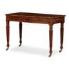 the rounded rectangular top with a moulded edge over a pair of short frieze drawers, on turned and lotus-carved tapering legs, ending in brass caps and castors