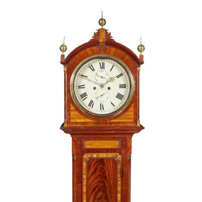the enamelled Roman number dial with subsidiary calendar and seconds dials, in an arched case with brass finials, above crossbanded trunk door flanked by quarter columns, on a plinth base raised on bracket feet; the eight day movement striking a bell, the backplate engraved FINNEMORE