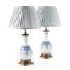 with everted rims, slim necks and moulded ovoid bodies, painted with repeating cloud-like motifs and raised on reeded and rope-form bronze bases, with modern fittings for electricity and light blue pleated shades